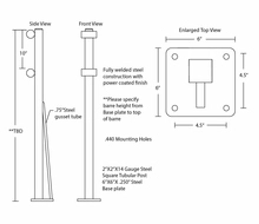 • Stanchion baseplate is 6” x 6” and has (4) 1/2" diameter holes, so you will need to use 3/8" diameter anchors. (See Guides & Diagrams)