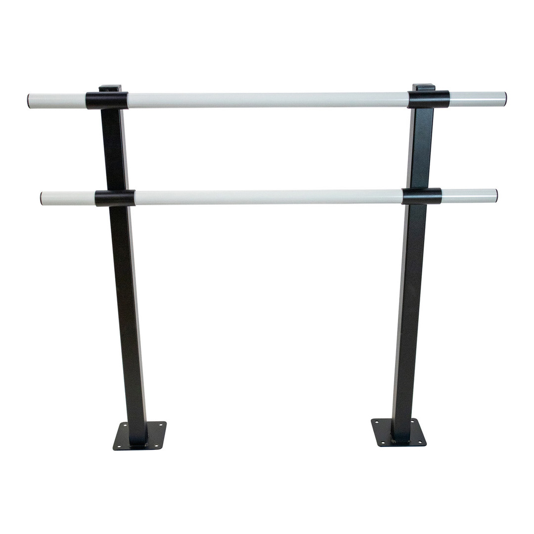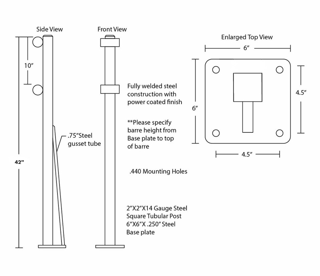 • Floor stanchions are made of heavy gauge steel and feature a light textured matte black powder coated finish and have an added support brace on the back for additional strength needed for barre fitness.